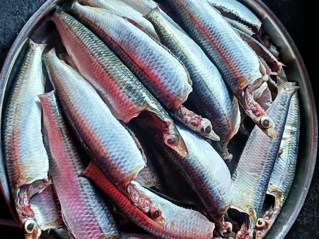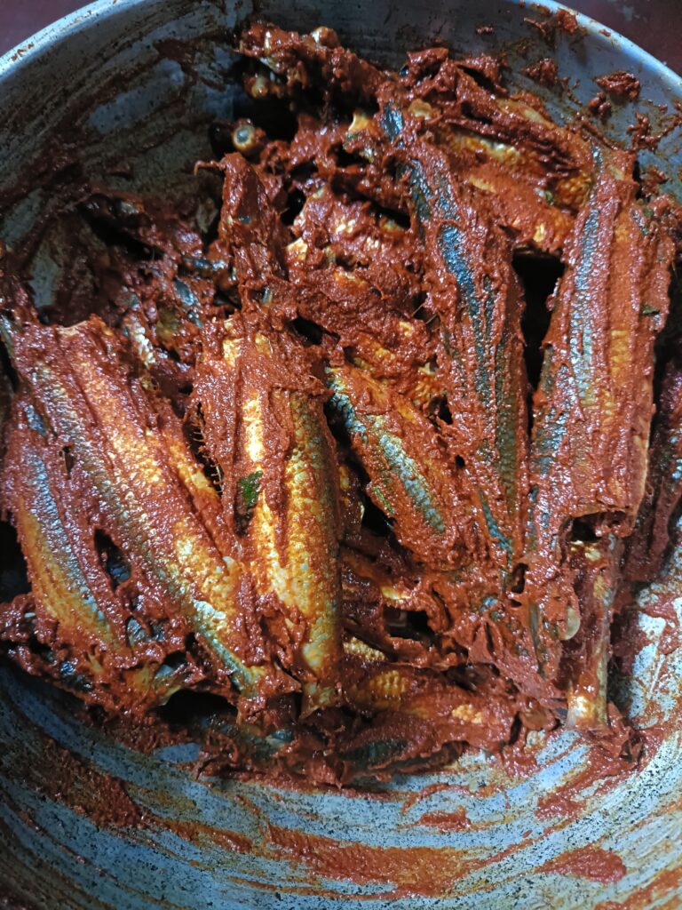 1. ಮೀನು ತೊಳೆಯುವುದು: ಮೊದಲಿಗೆ ಮತ್ತಿ ಮೀನುಗಳನ್ನು ಚೆನ್ನಾಗಿ ತೊಳೆದು, ಒಳಗಿನ ಅಂಗಗಳನ್ನು ತೆಗೆದುಹಾಕಿ ಶುದ್ಧವಾಗಿ ತೊಳೆಯಿರಿ.(ಬಾಲ, ರೆಕ್ಕೆಗಳನ್ನು ತೆಗೆಯಬೇಕು)