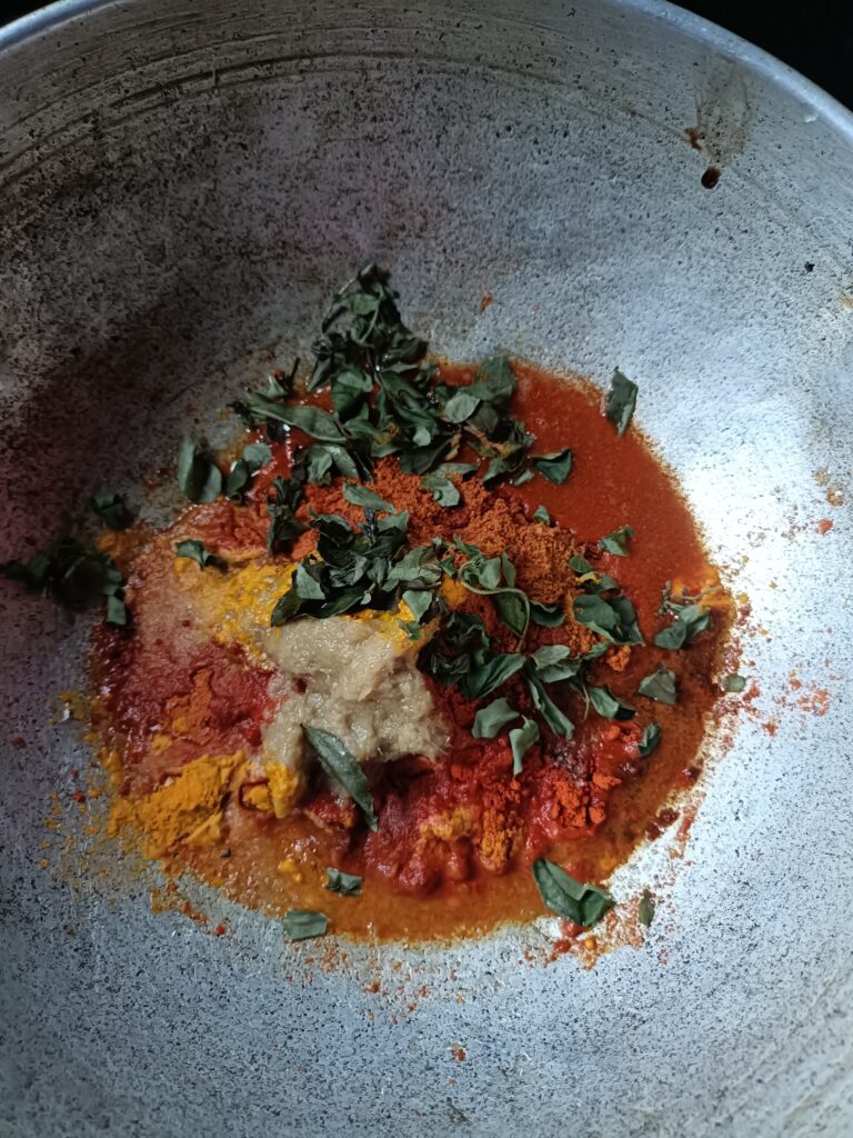 2. ಮಸಾಲೆ ತಯಾರಿ: ಒಂದು ಬಟ್ಟಲಿನಲ್ಲಿ ಮೆಣಸಿನ ಪುಡಿ, ಅರಿಶಿನ, ಉಪ್ಪು, ಶುಂಠಿ ಬೆಳ್ಳುಳ್ಳಿ ಪೇಸ್ಟ್, ಲಿಂಬೆರಸವನ್ನು, ಕಾಚಪುಳ್ಳಿ, ಅಕ್ಕಿಹಿಟ್ಟು, ಕರಿಬೇವು ಸೇರಿಸಿ ಚೆನ್ನಾಗಿ ಮಿಶ್ರಣ ಮಾಡಿ ಪೇಸ್ಟ್ ಮಾಡಿಕೊಳ್ಳಿ.