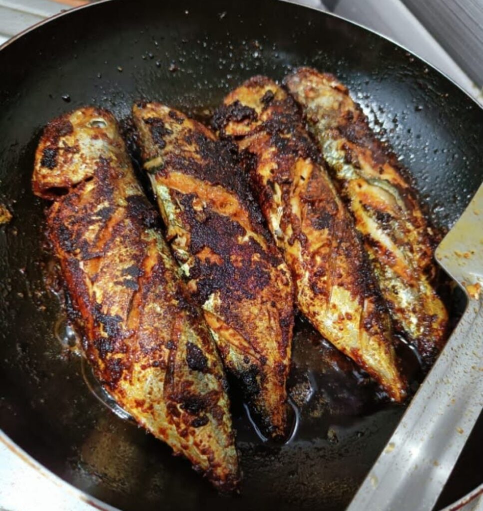4. ಫ್ರೈ ಮಾಡುವುದು: ಕಾವಲಿನಲ್ಲಿ ಎಣ್ಣೆ ಬಿಸಿ ಮಾಡಿ. ಎಣ್ಣೆ ಬಿಸಿ ಆದ ನಂತರ ಮೆರಿನೇಟ್ ಮಾಡಿದ ಮೀನನ್ನು ಒಂದೊಂದಾಗಿ ಹಾಕಿ ಮಧ್ಯಮ ಉರಿಯಲ್ಲಿ ಬಂಗಾರದ ಬಣ್ಣ ಬರುವವರೆಗೆ ಎರಡು ಬದಿಯನ್ನೂ ಫ್ರೈ ಮಾಡಿ. ಹೆಚ್ಚು ಉರಿಯಲ್ಲಿ ಬೇಯಿಸಿದರೆ ಮೀನು ಸುಟ್ಟು ಕರುಕಲಾಗಬಹುದು ಆದ್ದರಿಂದ ಮಧ್ಯಮ ಉರಿಯಲ್ಲಿ ನಿಧಾನವಾಗಿ ಫ್ರೈ ಮಾಡುವುದು ಉತ್ತಮ.