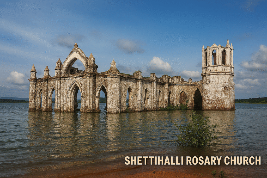 3. ಶೆಟ್ಟಿಹಳ್ಳಿ ರೋಸರಿ ಚರ್ಚ್ : ನೀರಿನಲ್ಲಿ ಮುಳುಗುವ ಅದ್ಭುತ ಚರ್ಚ್ ಕರ್ನಾಟದ ಹಾಸನ ಜಿಲ್ಲೆಯ ಶೆಟ್ಟಿಹಳ್ಳಿಯಲ್ಲಿ ನೆಲೆಸಿರುವ ರೋಸರಿ ಚರ್ಚ್ ಒಂದು ವಿಸ್ಮಯಕರ ಪ್ರವಾಸಿ ಸ್ಥಳ. ಈ ಚರ್ಚ್ನ್ನು “ನೀರಿನಲ್ಲಿ ಮುಳುಗುವ ಚರ್ಚ್” (Floating / Submerged Church) ಎಂದೇ ಪ್ರಸಿದ್ಧಿ ಪಡೆದಿದೆ. ಮಳೆಗಾಲದಲ್ಲಿ ಹೇಮಾವತಿ ನದಿಯ ಪ್ರವಾಹದೊಂದಿಗೆ ಈ ಚರ್ಚ್ನ ಭಾಗಶಃ ಅವಶೇಷಗಳು ನೀರಿನಲ್ಲಿ ಮುಳುಗಿ ಕೇವಲ ಗೋಪುರ ಮತ್ತು ಗೋಡೆಗಳೇ ಹೊರಗೆ ಕಾಣುತ್ತವೆ.