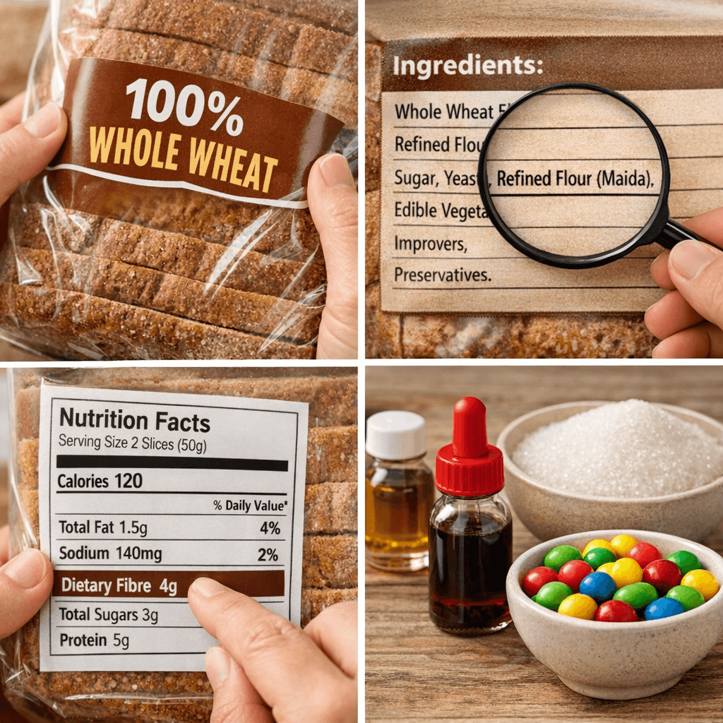 ಹೆಚ್ಚಿನ ಜನರು ಬ್ರೌನ್ ಬ್ರೆಡ್ ಎಂದರೆ ಅದು 100% ಗೋಧಿ ಹಿಟ್ಟಿನಿಂದ ಮಾಡಲಾಗಿದೆ ಎಂದು ಭಾವಿಸುತ್ತಾರೆ. ಆದರೆ ಹಲವಾರು ಬ್ರ್ಯಾಂಡ್ಗಳು ಮೈದಾ ಸೇರಿಸಿ ಬಣ್ಣ ಮಾತ್ರ ಕೊಡುತ್ತವೆ.