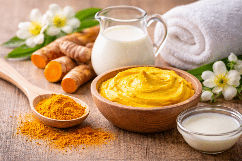 ಅರಿಶಿಣವು ಶಕ್ತಿಶಾಲಿ ಆಂಟಿ-ಸೆಪ್ಟಿಕ್ ಮತ್ತು ಆಂಟಿ-ಆಕ್ಸಿಡೆಂಟ್ ಗುಣಗಳನ್ನು ಹೊಂದಿದೆ. ಇದು ಚರ್ಮದ ಸೋಂಕುಗಳನ್ನು ಕಡಿಮೆ ಮಾಡುತ್ತದೆ ಹಾಗೂ ಮುಖದ ಹೊಳಪನ್ನು ಹೆಚ್ಚಿಸುತ್ತದೆ. ಹಾಲು ಚರ್ಮವನ್ನು ತೇವವಾಗಿರಿಸಿ ಮೃದುವಾಗಿಸುತ್ತದೆ.