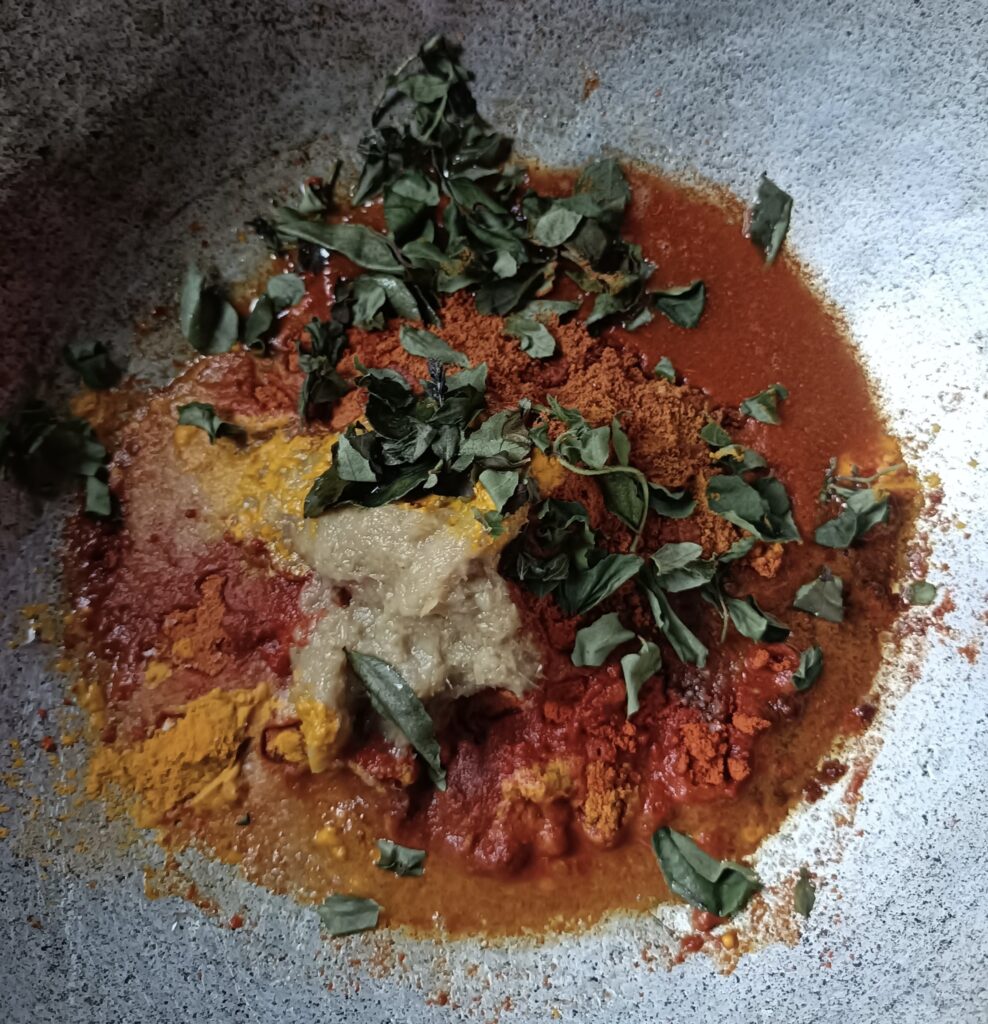 ಕೆಂಪು ಮೆಣಸಿನ ಪುಡಿ, ಧನಿಯಾ ಪುಡಿ, ಬೆಳ್ಳುಳ್ಳಿ–ಶುಂಠಿ ಪೇಸ್ಟ್ ಸೇರಿಸಿ ಪೇಸ್ಟ್ ತಯಾರಿಸಿ.ಬೇಕಾದಷ್ಟು ಉಪ್ಪು ಸೇರಿಸಿ, ಗಟ್ಟಿ ಪೇಸ್ಟ್ ಮಾಡಿ.